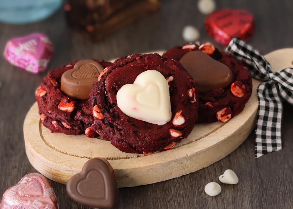 The inclusion of cornstarch and cream cheese in the dough result in a beautifully soft and chewy texture. In addition, the cream cheese brings more flavor to the party, introducing a subtle tang you won’t find in all-butter cookie doughs which is reminiscent of a classic red velvet cake. That flavor profile is enhanced even further by choosing cream cheese flavored baking chips instead of a more standard white chocolate chip.