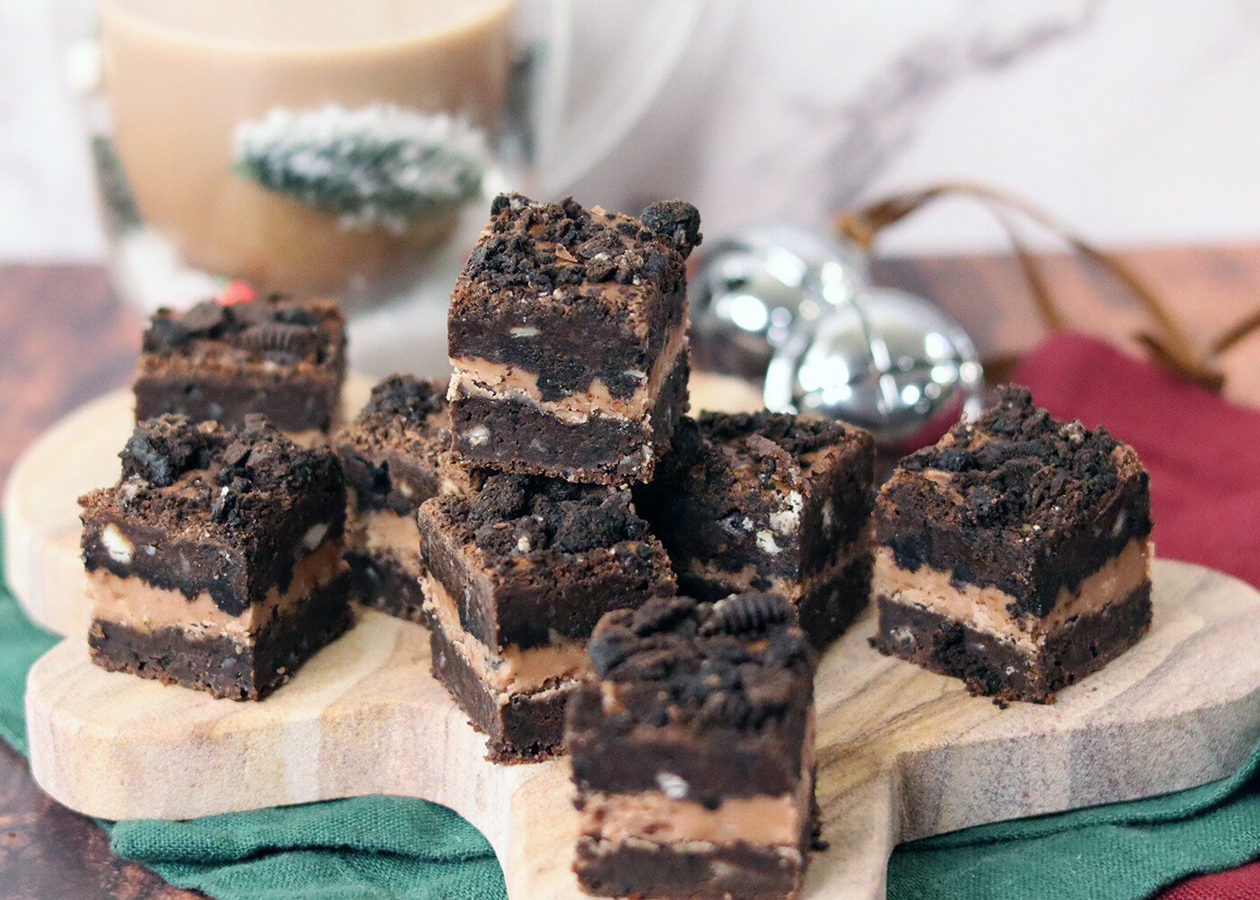 This week, I’m sharing the second of the three brownie recipes included on my Christmas goodie trays. This one is a definite crowd pleaser, combining fudgy brownie, creamy center and America’s favorite cookie, Oreos. These also get a little extra hit of cookies and cream from chopped up Hershey’s Cookies ‘N’ Creme candy folded into the batter.