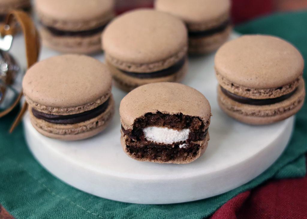 - If you are using the marshmallow filling, transfer the ganache filling to a piping bag. Pipe a thin dam of ganache around the outer edge of the bottoms of half of the macaron shells. Then pipe a small amount of marshmallow cream inside the ganache dam. Sandwich with the remaining half of the macaron shells.