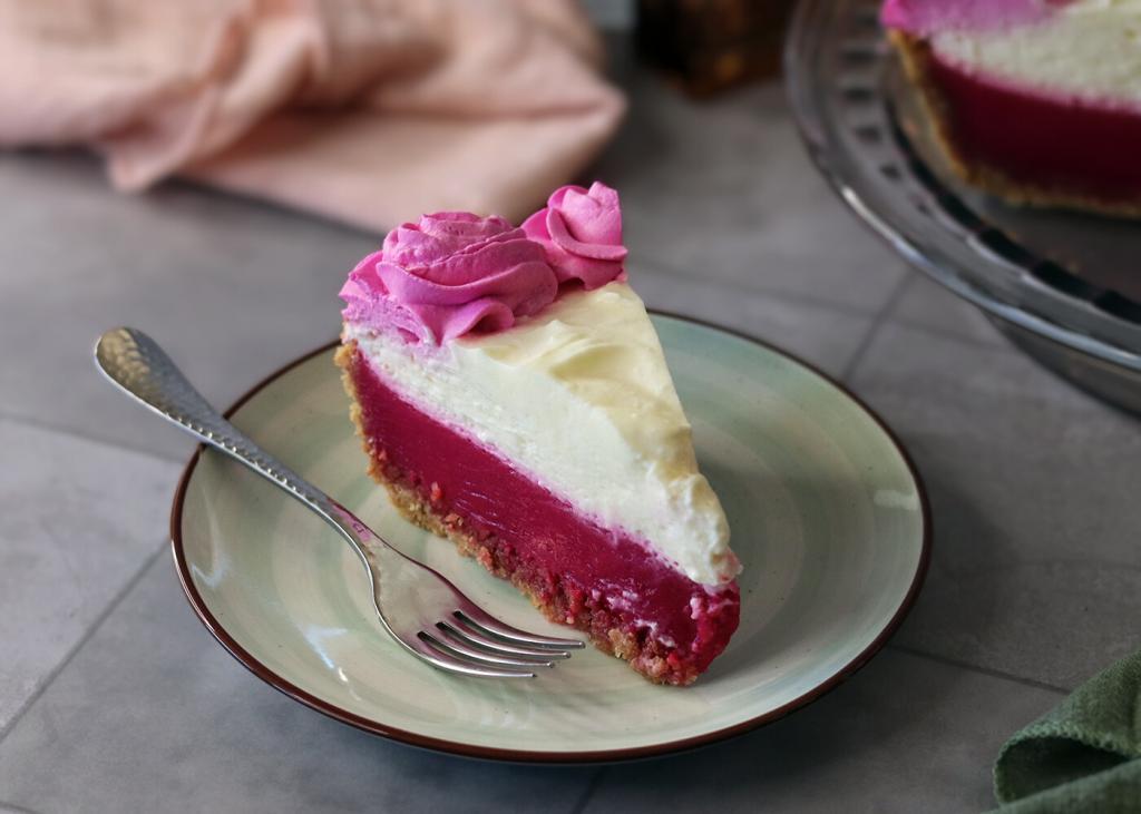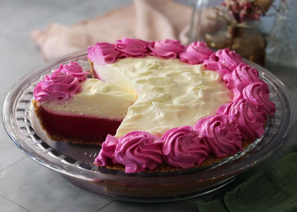 The only disappointment there for my family was that they didn’t get to eat the pie that I entered in the fair. To make it up to them, I decided to make another pie for Easter that year, and have continued to do so every year since. And that is how a pie made with the juice of a fruit that ripens in the fall made it onto my annual Easter dessert menu. Although prickly pear isn’t ripe in the spring, I have to say the colors of this pie just about scream spring with the bright, vibrant purply-pink tone of the prickly pear providing a lovely visual contrast to the soft, creamy, pale yellow of the lemon mousse, making it one of the prettiest and most spring-like offerings on my Easter table.