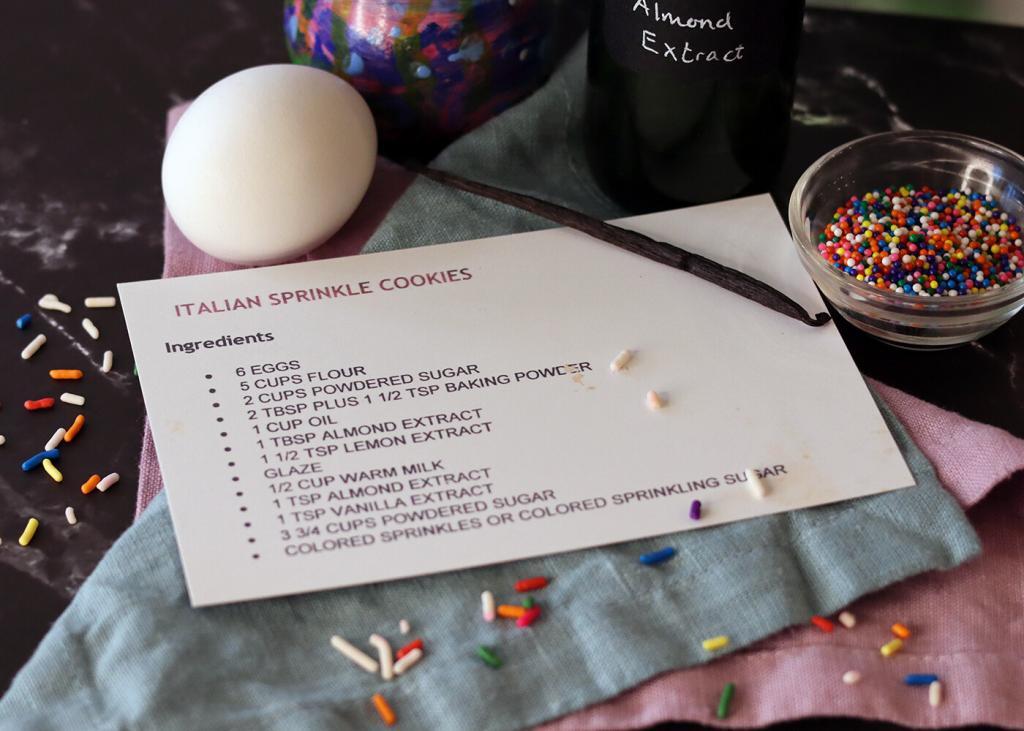 Italian sprinkle cookies are a traditional Italian cookie consisting of a soft, tender, cake-like cookie commonly flavored with almond, lemon and/or vanilla extracts dunked in sweet glaze and topped with colorful sprinkles. They are one of three cookies that I always associated with my Italian heritage — egg biscuits and wine biscuits, which my grandmother made, and these sprinkle cookies that my mom started making when I was a teenager. Mom persuaded grandma to share the egg and wine biscuit recipes and she included all three recipes in her dessert recipe binder.